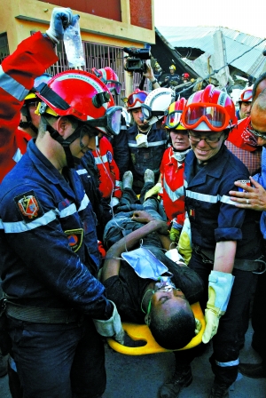 法国救援队23日从瓦砾里救出了一名24岁的海地男子。这名男子已经被埋了11天。救援队员们激动地说:“这简直就是生命奇迹。”