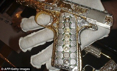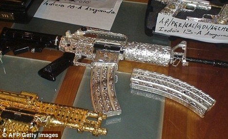 据报道,这些枪支显示了帮派奢华份子如何花用他们不法的财富。照片显示军方在墨西哥西部一次突击行动中,起出31支枪,大部分外表都包覆着黄金或白银外皮,或镶嵌着许多闪闪发光的钻石。