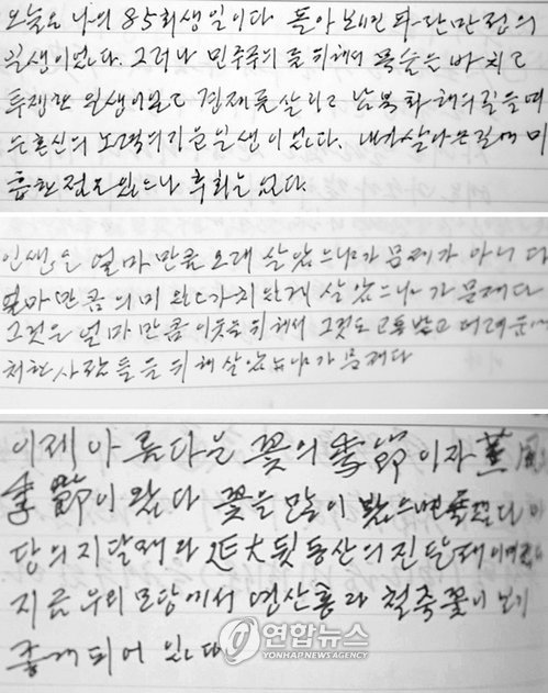 但他还进行自我激励说:“尽管吃了很多苦,但也取得了与众不同的成功,年龄也已经是85岁,在这世界上还有什么可盼的呢?一定要保持健康,为解决民主主义、国民经济、南北问题等进行必要的谏言和努力。”(4月27日)