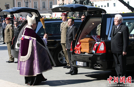当天早些时候,卡钦斯基夫妇的遗体由军方飞机从首都华沙运至克拉科夫,葬礼结束后,夫妇二人的遗体将被运往当地有着上千年历史的瓦维尔宫安葬。