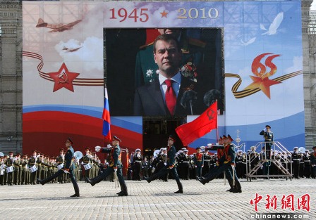 据报道,莫斯科时间5月9日上午10点(北京时间9日下午2点),俄罗斯在莫斯科红场举行盛大的阅兵式,庆祝卫国战争胜利65周年。