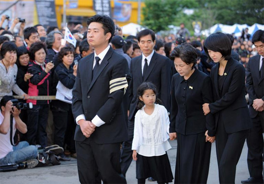 中新网5月29日电 据韩国《朝鲜日报》报道,韩国前总统卢武铉的出殡仪式29日凌晨在庆尚南道金海市进泳邑峰下村举行。图为,儿子卢建昊、夫人权良淑等遗属和卢武铉执政时期的政府人士们为故人行大礼的那刻,卢武铉的孙女向遗像作V型手势。