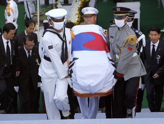 金大中遗属李姬镐女士等、韩国总统李明博和第一夫人金润玉、前总统金泳三、宪法机关负责人、驻韩外交使节、各国代表及市民等历史最大规模的3万多人参加了当天在国会前院举行的遗体告别仪式。仪式持续约90分钟。