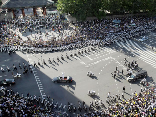 据报道,从遗体告别仪式举行地到东桥洞私宅、首尔市厅前以及铜雀洞国立墓地的路上,云集数十万人,送金大中最后一程。
