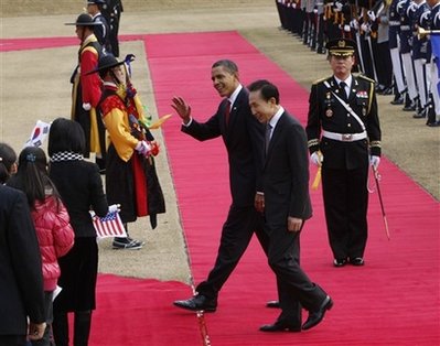 奥巴马和李明博政府一直对朝鲜施加金融制裁,并告知朝鲜若放弃核计划则可获得巨额回报。奥巴马于上周抵达亚洲,将于今日晚些时候回国。
