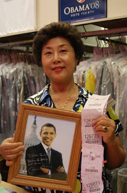 之前的30多年里,这家洗衣店是由另外一位韩国人经营,姜女士是在去年刚接手过来的。她表示:“听之前的店主人说‘奥巴马1992年和妻子米歇尔结婚后就成了我们店的常客’。即使在竞选期间,他每周也送洗两次衣服。”说着,她还展示了奥巴马的照片和他开出的回执。
