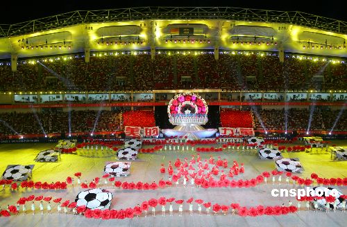 9月10日晚,2007年女足世界杯在上海虹口体育场开幕。开幕式通过古典与历史、青春与现代、柔和与绚烂、激情与速度的视觉演绎,来表达对世界女足运动发展历程的崇高敬意,展现东道主对参加2007年女足世界杯来宾的热烈欢迎。中新社发 汤彦俊 摄
