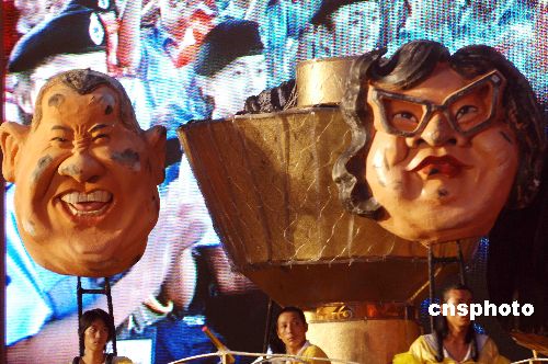 2007年,香港明星曾志伟、沈殿霞的大头像出现在深圳世界之窗举行的“花开正十年”大型联欢晚会巡游行列中。中新社发 陈文 摄