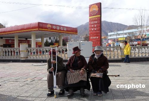 3月20日,三名藏族大婶坐在拉萨市街头长椅上晒太阳,享受明媚春光。