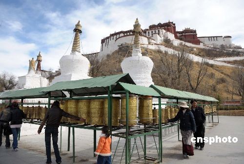 3月20日,拉萨民众在布达拉宫下的宗角禄康公园内转经。