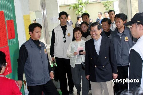 二00八台湾地区领导人选举投票三月二十二日举行,中国国民党候选人萧万长与夫人在台北一个投票所投票。中新社发 黄少华 摄