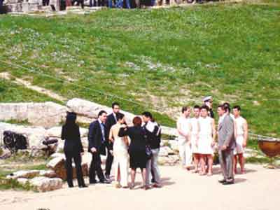 最激动人心的时刻即将来临,最高女祭司娜芙普利都将在赫拉神庙的凹面镜前点燃奥运圣火。从古竞技场到圣火采集地的赫拉神庙的路上,中间有一个通道,“禁地”前可谓戒备森严,只有少数VIP贵宾才能进入。这时,章子怡也想起身近距离观看点火仪式,但在通道前被安保人员拦住。他们显然没弄清楚这位美女的身份,很疑惑地看着章子怡,身边的2008北京奥运官方电影工作人员则赶忙解释:“super star”(超级巨星)。但胸前只是挂着记者证,并非VIP证的章子怡,尽管举着证交涉了半天,还是被拦在了赫拉神庙之外。