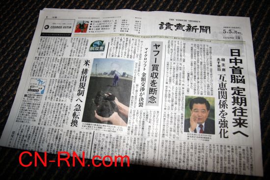 《读卖新闻》报道中特别关注中日两国能否透过胡锦涛此行,全面推进中日两国的战略性互惠关系发展。