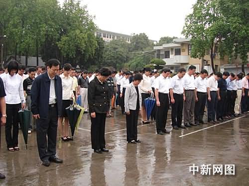 五月十九日十四时二十八分,近千名福建漳州市党政机关干部冒着绵绵细雨,在政府大院的国旗下默哀,深切哀悼四川汶川大地震遇难同胞。正在当地考察的全国人大常委会副委员长陈至立(前排左二),和福建省政府、人大官员一起参加默哀。吕峰鹏 摄