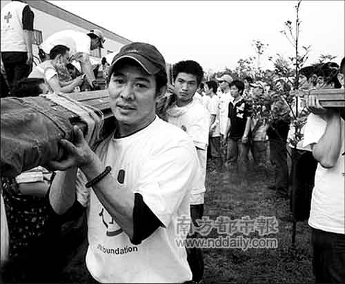 李连杰近日亲赴汶川地震灾区前线。除了带去3吨多救援物资、50多万人的捐款,以及两支救助志愿者队伍外,更身体力行亲自上阵,搬运帐篷,参与重建。昨天上午,李连杰在成都出席“中国红十字会李连杰壹基金5·12四川地震赈灾临时指挥部”成立发布会。据悉,临时指挥部已构建起三个小组:统筹组、物资运输组和外联组。李连杰表示,“明天第三批物资要过来,近期会在江油等地建立壹基金之家,帮助130多所学校的学生复课。”截止到昨天中午12时,壹基金已筹集善款5654.57万元人民币,有超过66万人次参与捐款。不少网友感动地称,李连杰是一个“超级英雄”。