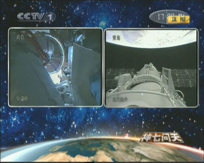 图:“神七”航天员翟志刚走出舱外开始实施出舱活动
