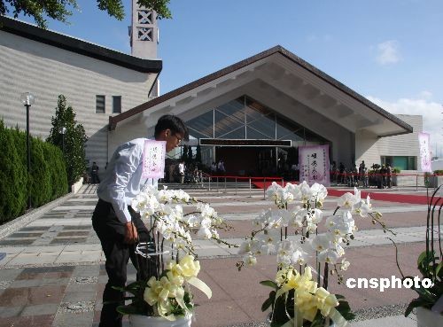 台塑企业创办人王永庆的遗体十七日由长荣班机运抵台湾,灵堂设在桃园县的长庚大学活动中心。图为灵堂外景。中新社发 耿军 摄