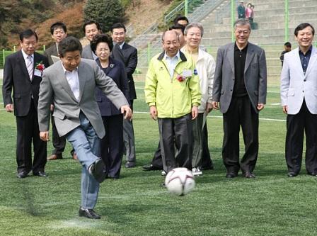 2007年4月8日,卢武铉在釜山商业高中校友体育大赛上开球。