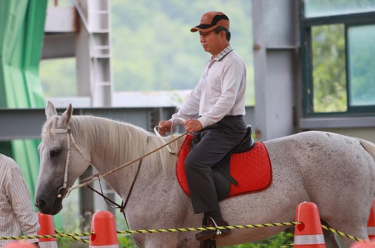 2008年7月22日,在江原道平昌一个农场,正在体验骑马的卢武铉。