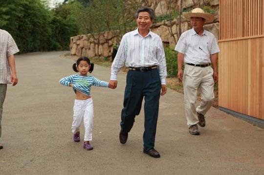 2008年8月16日,卢武铉和孙女兴致勃勃去看望修建草坪的志愿者。孙女的样子天真浪漫。