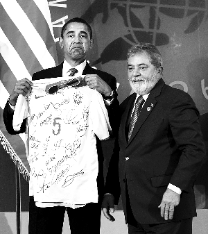 美国总统贝拉克·奥巴马9日和巴西总统卢拉·达席尔瓦会面时,双方大谈足球经,卢拉还送给奥巴马一件巴西国家男子足球队成员签名的球衣。