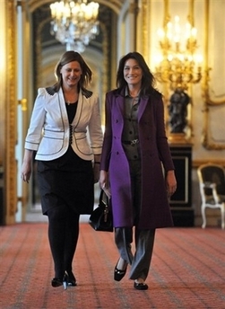 资料图片:英国首相夫人莎拉(左)与法国第一夫人布吕尼。