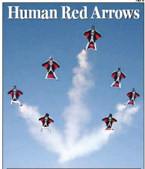 “Topgun”的特技飞行队的领队、现年35岁的马克·哈里斯是北安普敦郡凯特灵市人,他已经进行了6000多次蝙蝠式飞翼极限跳伞运动,可谓是经验丰富。他说:“多年来,飞翼跳伞员一直尝试在下落过程中完成各种编队图案,但我们研究了‘红箭’特技飞行队的编队以及他们在空中的飞行技巧,这给了我们很大启发。飞翼服能给人带来最为逼真的飞行感觉,并让你在空中滑行,而不是像普通降落伞那样自由坠落。在进行编队表演时的那种感觉平和而美妙,你忍不住要屏住呼吸,想把眼前美景尽收眼底。”
