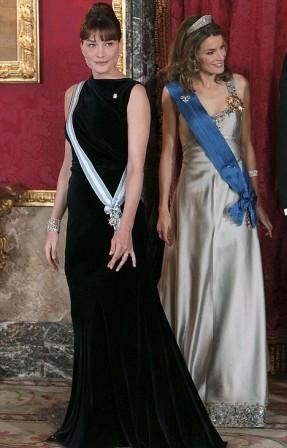 在会见西班牙王储妃莱蒂西亚时,布鲁尼身穿黑色长裙,头发高高挽起,露出美丽后背,成为众人瞩目的焦点。但是王储妃莱蒂西亚头顶皇冠,一身浅色绸缎长裙,曳地闪闪发光,多少抢去了布鲁尼的一些风头。