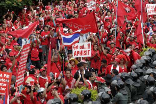 面对红衫军围堵东盟峰会,阿披实政府的态度转趋强硬,扬言要拘捕及起诉示威领袖。阿披实说那些顽固的示威者已经不能被晓之以理,一些人必须对目前的形势负责,并称“示威者已经显示出他们想违反法律并引起社会混乱,所以我们将以刑事罪名对他们提起公诉。”