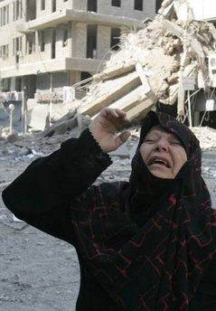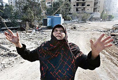 路透社的照片显示,一名妇女站在贝鲁特一座被以军空袭炸毁的建筑物前。路透社在图片说明称:“一名黎巴嫩妇女在查看自己公寓的废墟后痛哭,公寓在以色列对贝鲁特南部的空袭中被毁 。”照片的标注日期是2006年7月22日。