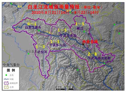 预计,21日14时至22日14时,白龙江流域面雨量有1~5毫米,其中干流舟曲至武都流域面雨量有2~8毫米,白龙江流域发生地质灾害的可能性较大。