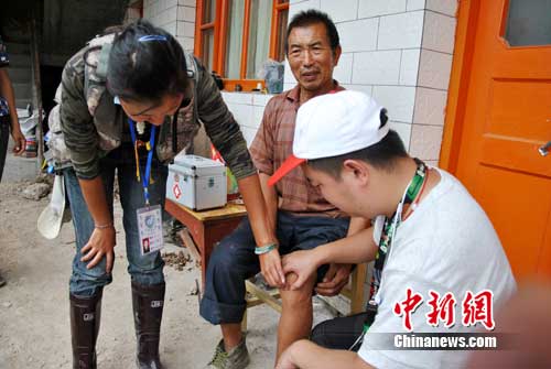 记者正在与薛新民保交谈时,来自银川的刘志和北大外科系的王健几个自愿者刚好来到了,刘志拿着保健箱为薛新民保检查了一下身体,他的腿有点痼疾外,身体还算健康。