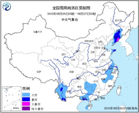 中新网8月26日电 据中央气象台报道,中央气象台8月26日18时发布暴雨蓝色预警:8月26日20时到8月27日20时,吉林南部、辽宁中东部、山东半岛东部、江苏东部和南部、安徽南部、浙江西部、江西东北部以及湖南南部、贵州东部广西中东部、海南西部、云南中西部等地有大到暴雨,其中辽宁东部的局部地区有大暴雨,上述局地并伴有短时雷雨大风等强对流天气。