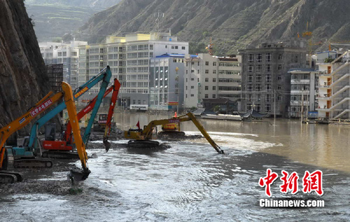 中新网南昌8月26日电(何柳斌 徐迎华 聂中成)8月26日,武警水电部队官兵在甘肃舟曲白龙江城江大桥上游进行清淤翻渣施工作业。当日,武警水电部队所承担的作业区域已经延伸至城江大桥上游300米处。