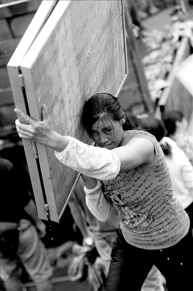 罗炳辉将军广场是彝良最大的灾民安置点之一,2000名受灾群众集中安置在百余个帐篷内。50多岁的毛振强和老伴带着两个孙子一起住在帐篷里。前天夜间,他和安置点的其他人一样,被大风和暴雨扰得睡不着觉。昨天凌晨1点左右,广场上开始积水,很快水就漫过薄薄的纸板,被褥衣物都洇湿了。“我们赶紧把东西收拾起来,就这么站了一夜没能睡觉。”由于帐篷内物品进水,昨天白天,安置点内的很多灾民连坐的地方都没有,蹲在地上吃饭,也没法睡觉。