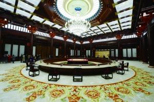 雁栖湖国际会议中心集贤厅,APEC领导人圆桌会议即在此召开,其设计亮点是木制装修与景泰蓝技艺结合。
