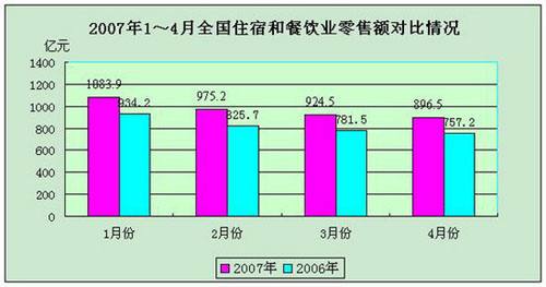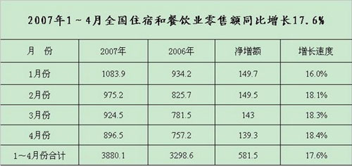 中新网5月23日电 据商务部网站消息,商务部商业改革司根据有关数据分析,今年4月份,全国住宿与餐饮业零售额实现896.5亿元,同比增长18.4%。今年1-4月份,全国住宿与餐饮业零售额累计实现3880.1亿元,同比增长17.6%,比去年同期增幅高出3.1个百分点,占社会消费品零售总额的比重达到13.9%,拉动社会消费品零售总额增长2.4个百分点,对社会消费品零售总额的增长贡献率为15.9%。