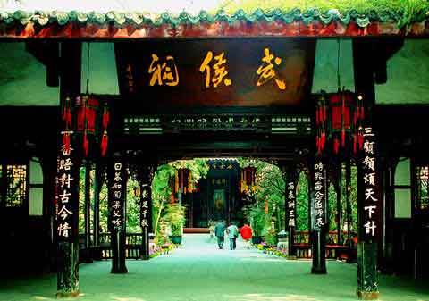 成都武侯祠位于市区南,肇始于刘备下葬惠陵时,即公元223年。是全国唯一的君臣合祀祠庙和最负盛名的诸葛亮、刘备及蜀汉英雄纪念地,有三国圣地之美誉。1961年国务院公布为全国第一批重点文物保护单位。