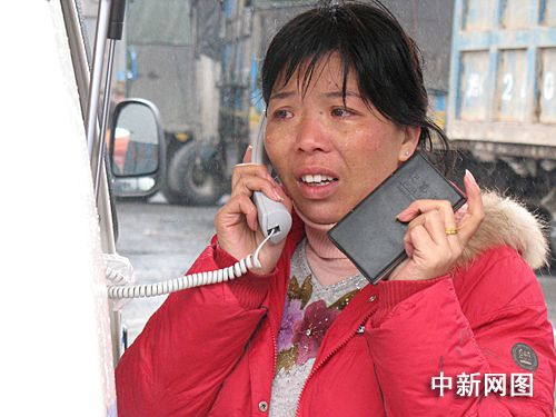 一月二十八日傍晚,广东京珠北韶关境内,来自湖北襄樊的庞女士一边流泪一边与家人报平安。因冰雪挡道,庞女士乘坐的客车被迫滞留路上。中国移动韶关分公司免费提供流动无线电话车让滞留旅客向家人报平安。