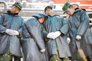 “真是太不好意思了!”下午4点25分,在该部二连会议室,记者见到了4名战士的“庐山真面目”。面对记者的追问,他们对“站着睡觉”一事表现得十分尴尬。“作为班长骨干,我们更愿意将自己威武刚毅的形象展现给人民群众,可是由于已经连续奋战了39个小时,确实累得没有办法。从到火车站执行任务开始,背包都没有打开过。”黄金华说。