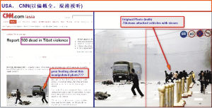 其一是“以偏概全,混淆视听”。3月17日,CNN和法新社在各自网站上使用了同一张图片,图中两辆绿色卡车一前一后正向两名平民驶来——事实上,如果完整展示图片的话,可以看到当时军车旁有约10名暴徒在向军车投掷石块,虽然CNN网站的图片说明写的是“藏人向军车投掷石块”,但图中却看不见这一已被裁去的场景。