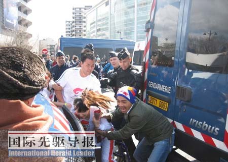 本报记者亲眼看到,一个“藏独”分子突然跳进安全防护栏,旁边的法国警察眼疾手快,迅速把他按倒在地,然后扔出了安全防护栏。即使遇到一些政客出来挑事,警察也同样不会客气。据英国《卫报》记者记述,一个巴黎市绿党议员在火炬接力开始时突然表示抗议,很快被警察请了出去。