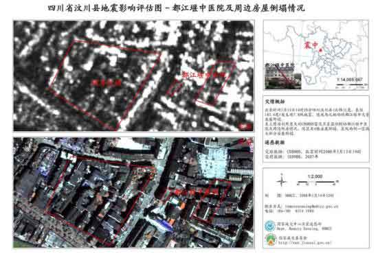 另外,5月14日上午,北京同天视地空间技术有限公司根据国家减灾中心紧急需求,提供了最新的COSMO-SkyMed高分辨率(3米和1米)雷达卫星数据(都江堰地区)。国家减灾中心随即组织技术人员及相关单位的专家对都江堰地区的地震灾害受损情况进行了目标识别与遥感灾情评估,结果如上图。