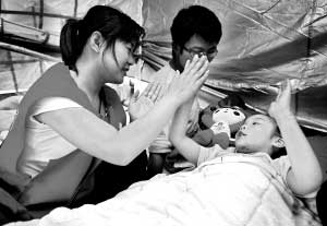 接着她来到搭建在医院广场的7号医疗帐篷,一个腿部严重受伤的小女孩躺在简易的床位上。这位失去父母的女孩叫鑫怡,突然失去爸爸妈妈的鑫怡变得沉默起来,也睡不着。