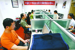 昨日,中国红十字基金会地下室,紧急开辟出的数据处理办公室里,工作人员正在处理捐款信息。记者 吴江 摄