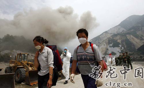 居民离开映秀镇,背后升起爆破拆除房屋而产生的浓烟。记者 韩亿国摄 (来源:彩龙中国)