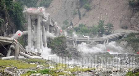 随着“轰”的一声巨响,被地震震毁的百花大桥残余桥体轰然倒下。(来源:四川在线)