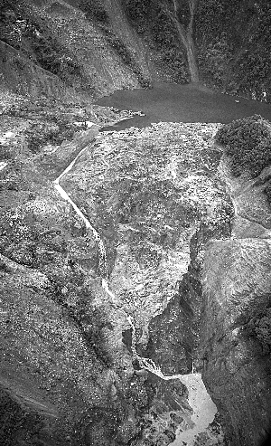 俯拍的唐家山堰塞湖泄流情景。昨日7时,唐家山堰塞湖开始泄流。杨卫华 摄