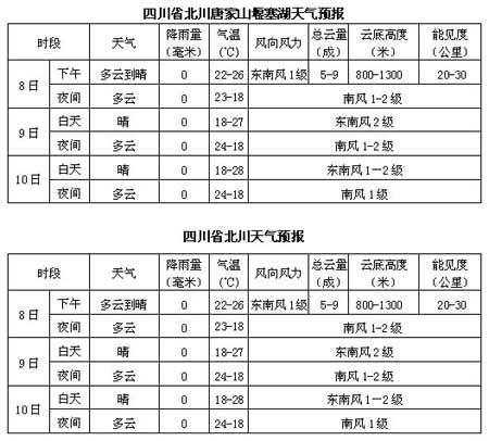 天气预报:预计8至13日,地震灾区主要以多云或晴为主,有时有小阵雨,气温较高,湿度较大,其中,四川成都、绵阳、德阳、广元以及甘肃文县、陕西略阳、宁强等地日最高气温可达27~32℃,帐篷内温度34~40 ℃,四川汶川、茂县、理县日最高气温可达24~27℃,帐篷内温度28~33℃。注意采取防暑降温措施。