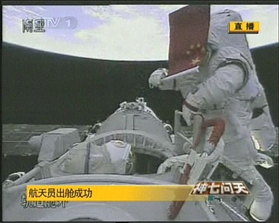 中新网9月27日电 中国“神七”载人飞船航天员翟志刚今天下午16时43分左右顺利出舱,实施中国首次空间出舱活动。他在出舱活动中展示由刘伯明递过来的中华人民共和国国旗。